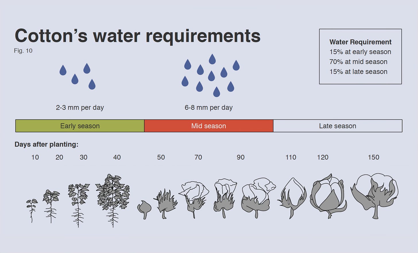 All cotton is essentially watered either by rain or by irrigation. Today we start with rainfed cotton. Rainfed cotton takes up a larger area than irrigated cotton, but produces less yield, because it is less predictable, and harder to manage fluctuations.